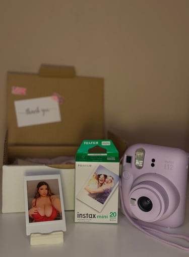 Chaques box aura également sa photo Polaroïd faites le jour de la préparation de la commande. Elle sera faite avec l'ensemble , la paire de chaussettes ou la paire de collants qu'il y aura dans ta box pour que tu puisse voir a quoi ton ensemble , tes chaussettes ou tes collants ressemble quand je les porte.